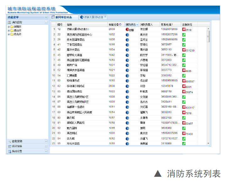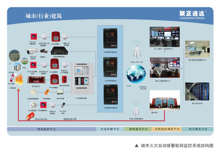 城市火災(zāi)自動(dòng)報(bào)警聯(lián)網(wǎng)監(jiān)控系統(tǒng)利用公共通信網(wǎng),采用無線/有線通信方式,通過自主生產(chǎn)的火災(zāi)報(bào)警傳輸設(shè)備將各社會(huì)單位獨(dú)立運(yùn)行的火災(zāi)自動(dòng)報(bào)警系統(tǒng)進(jìn)行統(tǒng)一聯(lián)網(wǎng),實(shí)時(shí)傳輸聯(lián)網(wǎng)用戶火災(zāi)自動(dòng)報(bào)警系統(tǒng)及其相關(guān)消防系統(tǒng)的火災(zāi)、故障及運(yùn)行狀態(tài)等情況,達(dá)到對(duì)聯(lián)網(wǎng)用戶的消防信息集中處理、實(shí)時(shí)監(jiān)控的目的。系統(tǒng)在10秒內(nèi)接收到聯(lián)網(wǎng)用戶火災(zāi)自動(dòng)報(bào)警系統(tǒng)發(fā)出的火警信息,經(jīng)監(jiān)控中心確認(rèn)為真實(shí)火警后可自動(dòng)傳送到119指揮系統(tǒng),并為消防部門提供發(fā)生火警單位的精確電子地圖位置、樓層平面圖、消防報(bào)警設(shè)備分布圖、周邊消防栓等消防資源分布圖、消防預(yù)案等信息,有效輔助消防部門快速反應(yīng),達(dá)到的“快速報(bào)警、迅速滅火”的目的。系統(tǒng)實(shí)時(shí)對(duì)聯(lián)網(wǎng)用戶的消防報(bào)警系統(tǒng)遠(yuǎn)程監(jiān)控,及時(shí)發(fā)現(xiàn)設(shè)備故障;通過對(duì)聯(lián)網(wǎng)用戶值班人員的遠(yuǎn)程查崗,監(jiān)督值班人員的在崗情況;系統(tǒng)還對(duì)聯(lián)網(wǎng)用戶的消防安全管理信息等進(jìn)行管理,為公安消防部門和聯(lián)網(wǎng)用戶提供信息服務(wù),通過登錄系統(tǒng)平臺(tái),消防管理部門可以實(shí)時(shí)監(jiān)控檢查重點(diǎn)消防單位的消防設(shè)施運(yùn)行情況和人員值班情況,提高監(jiān)督執(zhí)法的針對(duì)性和有效性;聯(lián)網(wǎng)單位也可以登錄系統(tǒng)查詢自身單位消防設(shè)施運(yùn)行情況的統(tǒng)計(jì)信息,建立消防檔案,制作滅火預(yù)案,開展網(wǎng)上培訓(xùn)、隱患登記整改等消防安全管理工作,提高單位自身的消防安全管理水平。