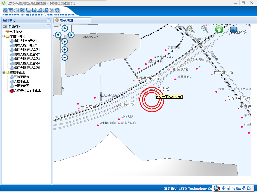 采用GIS技術(shù)(消防GIS),當(dāng)選擇任何一個(gè)聯(lián)網(wǎng)單位時(shí),地圖系統(tǒng)自動(dòng)顯示該單位在地圖上的具體位置。當(dāng)設(shè)備報(bào)告火警發(fā)生時(shí),地圖會(huì)自動(dòng)居中顯示聯(lián)網(wǎng)單位,并報(bào)以聲光警示。